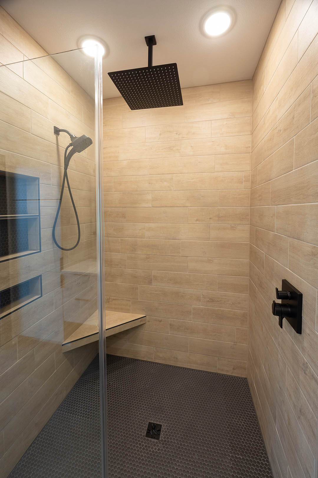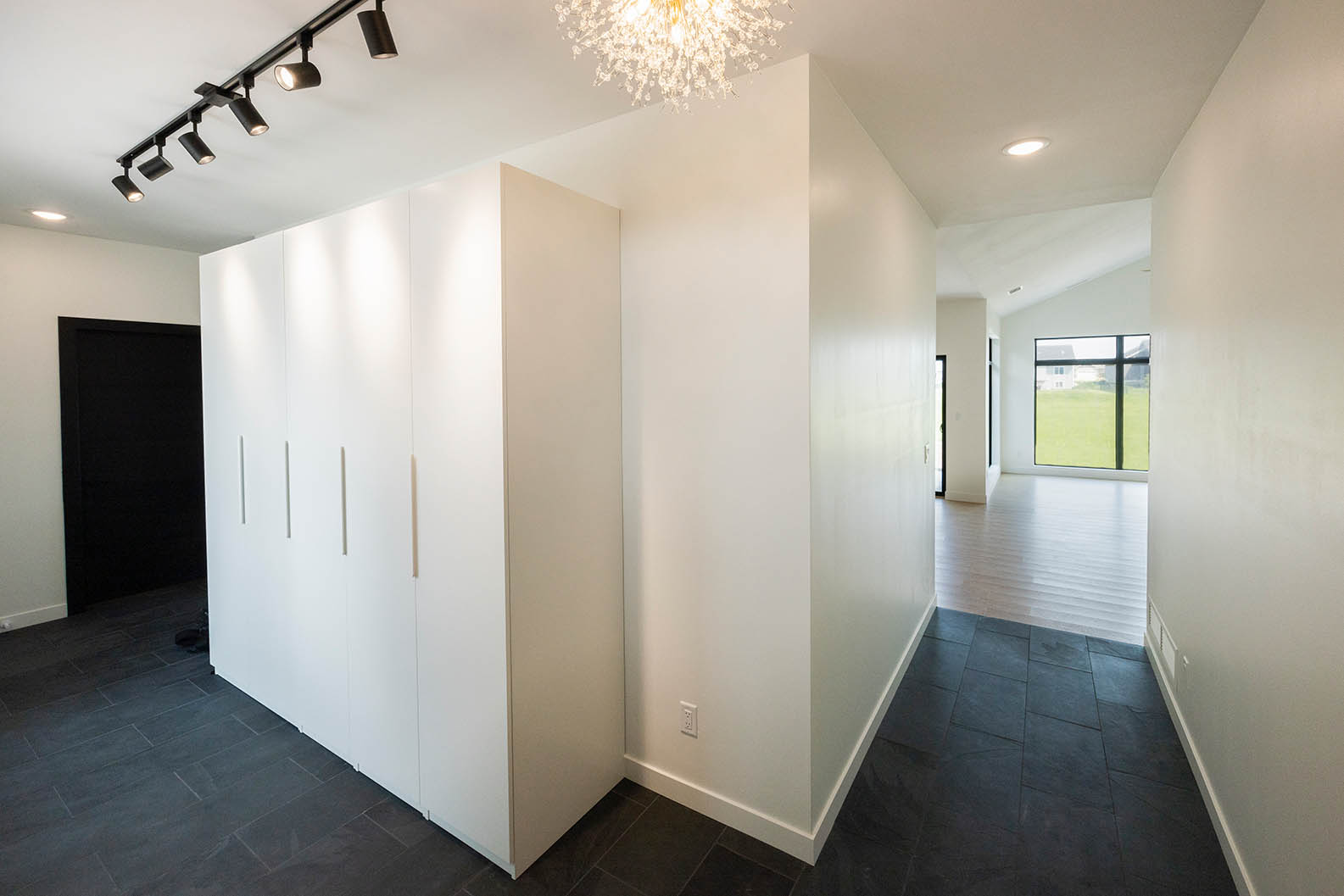 - Eco-friendly cork flooring in the main living space and natural stone in the entry way